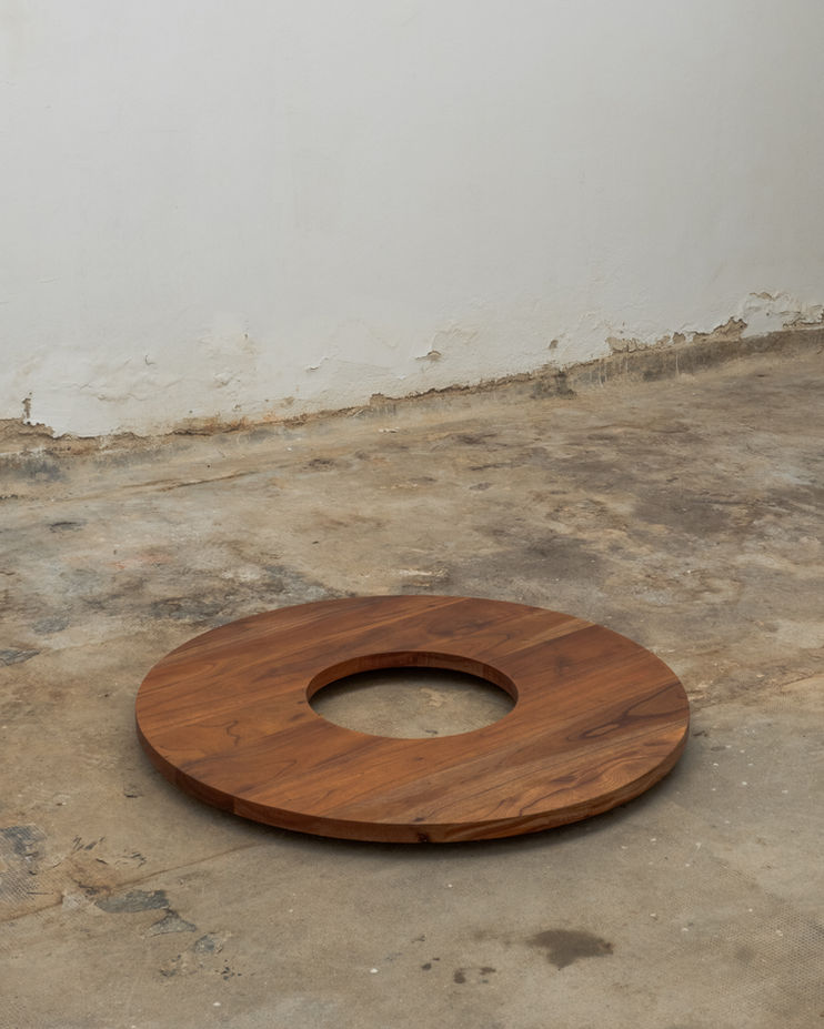 Mesa realizada en madera maciza, concebida a partir de un sistema de patas desmontables que se vinculan entre sí mediante un encastre en cruz.